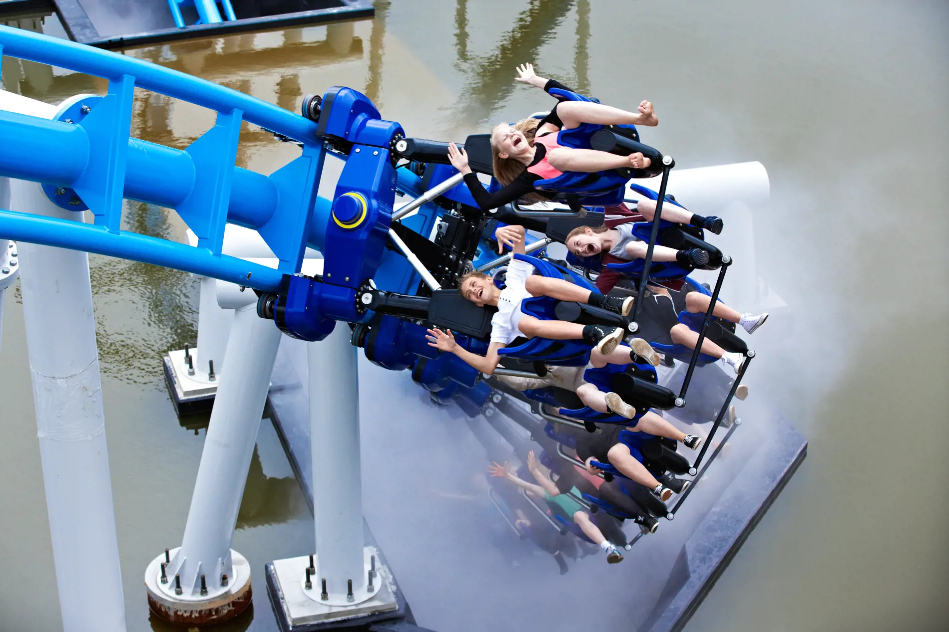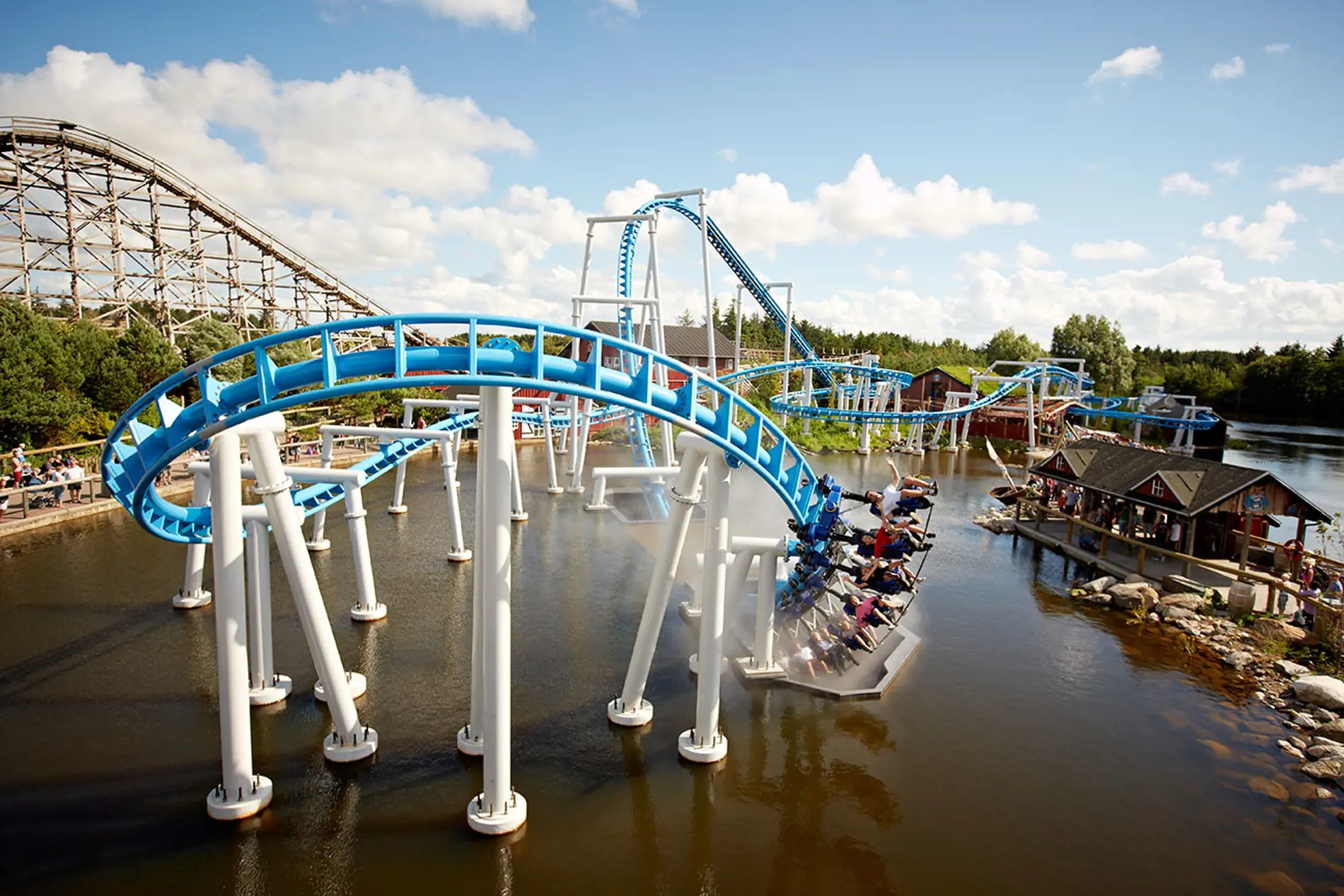 Orkanen bringt dich zunächst hoch hinaus und danach rast er – als einzige Achterbahn Nordeuropas – unter die Wasseroberfläche durch einen unterirdischen Tunnel und weiter in halsbrecherischem Tempo, während deine Füße frei in der Luft baumeln!