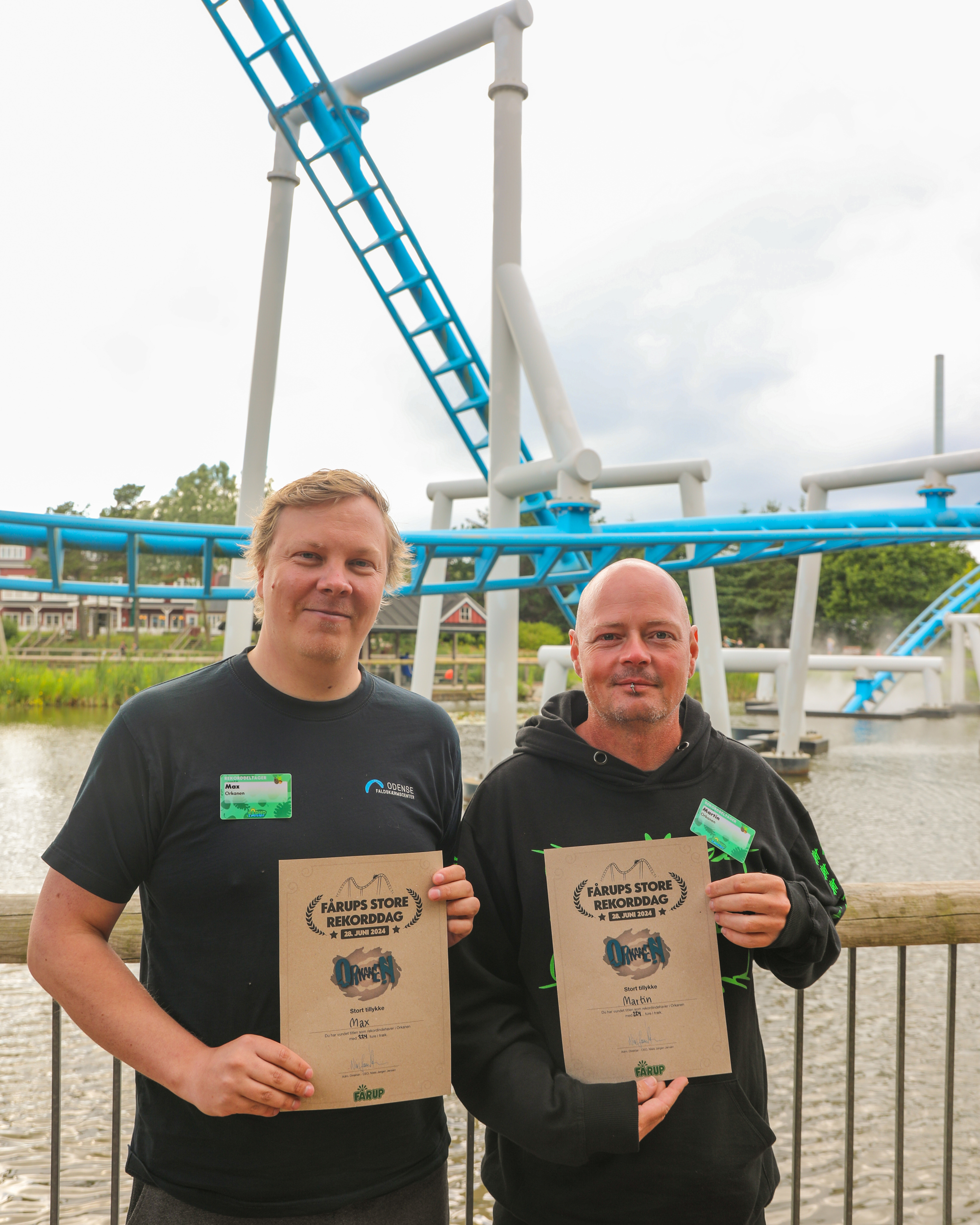 Max og Marting blev siddende hele dagen fra kl. 09:00 til 17:00 og nåede op på 224 ture i træk - og kan derfor begge kalde sig rekordindehaver i Orkanen. De slog rekorden fra 2023, som var på 211 ture i træk.