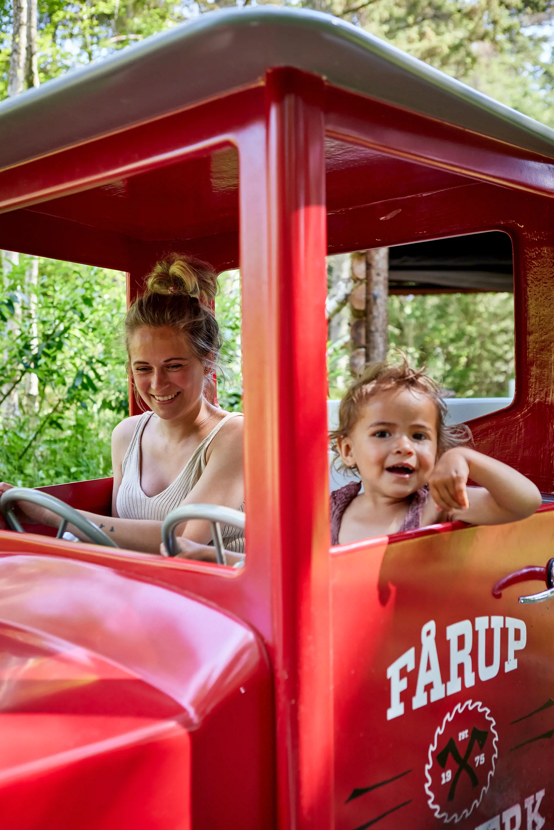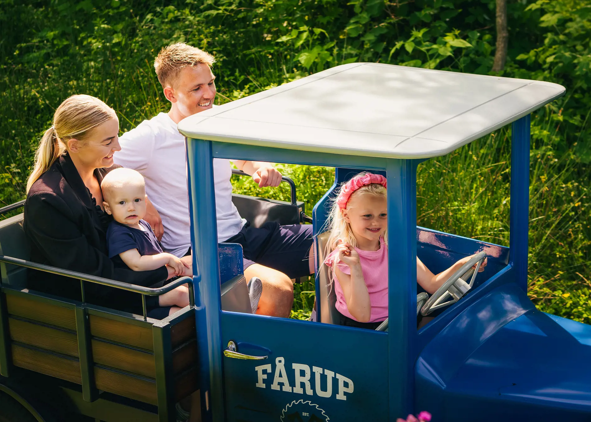 Skovturen tager dig på en hyggelig ekspedition gennem skovlandskabet - forbi plaskende vandfald, den eventyrlige dyrehøj og skovhuggerens hjem - mod Fårup Savværk! Så det er bare at hoppe om bord og nyde turen!